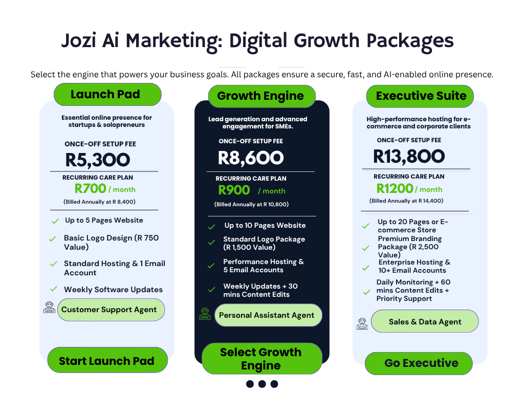 We replace the guesswork and complexity of traditional agencies with AI-driven accountability. See the three Growth Engines built for South African SMEs, independent business owners, and contractors.